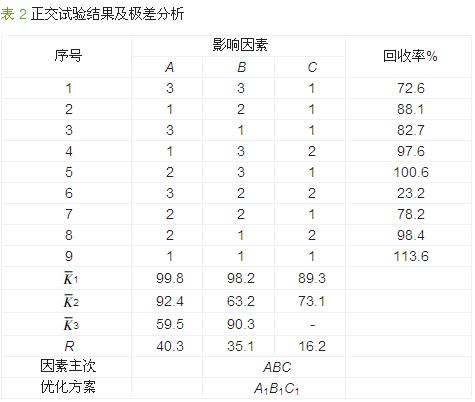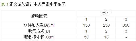 從表 2可以看出,因子A水樣加入量的R值較大,即加入水量的多少會顯著影響回收率,其中 1> 2> 3,故水樣加入量優先選擇150 mL;B因子對測定也有一定影響,由于 1> 3> 2吹氣方式選1;C因子對回收率的影響相對較弱,因 1> 2,吸收液量選取50 mL。按極差分析得出的優化方案為A1B1C1即第9組試驗,其回收率為113.6%>>100%,可推測其受外界干擾因素較多,不符合優化條件的選擇。由于顯著影響因子A的水平1、2的 相差較小,并且實驗發現組合為A2B1C1時平均回收率為99.7%(n=6,RSD=5.63%),綜合考慮后選取A2B1C1為最優條件。