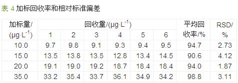 (2)精密度實驗。對不同濃度的標準溶液進行吹脫捕集前處理,隨后進離子色譜檢測,每個水平做6次平行實驗,樣品的回收率良好,平均回收率均>90%,且各平行相對標準偏差均不超過5%,重現性良好,結果見表 4。