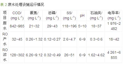 脫脂廢水、磷化廢水、噴漆廢水和電泳廢水等機械加工廢水的有機物濃度較高,且含有礦物油、懸浮物和氮磷等污染物。通過氣浮和混凝沉淀處理可將COD降低到700 mg/L左右,生物系統(缺氧和好氧工藝)可將COD降低到70 mg/L左右,出水可穩定達標排放。實際運行時首先投加NaOH將廢水pH調至8.5~9.0,然后按照3、5、1.0 mL/L的投加量分別加入5%(質量分數,下同)的CaCl2溶液、10%的聚合氯化鋁和5%的聚丙烯酰胺溶液,混合反應60 min后進入氣浮池,氣浮出水按6、1.5 mL/L投加量分別投加10%的聚合氯化鋁和5%的聚丙烯酰胺溶液,混凝沉淀出水最后進入生物處理系統,生化出水經砂濾器、炭濾器、超濾、保安過濾器和反滲透深度處理后回用于生產,反滲透濃水可達到GB 8978—1996三級標準。該工程已穩定運行4 a多,從實際檢測結果來看,反滲透產水COD穩定在32~45 mg/L,電導率穩定在18~42 μS/cm,可滿足生產用水水質要求;反滲透濃水COD穩定在128~302 mg/L,SS穩定在26~51 mg/L,達到GB 8978—1996三級標準后達標排放,其主要水質指標如表 2所示。具體參見http://www.bnynw.com更多相關技術文檔。