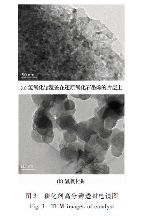 催化劑的表面結(jié)構(gòu)特征用日本JEOL公司的型號(hào)為JEM-2100F的高分辨透射電鏡進(jìn)行測(cè)試。測(cè)試時(shí)加速電壓為200kV。圖3為催化劑的高分辨透射電鏡圖。從圖中可以看出,大量的氫氧化鈷晶體覆蓋在還原氧化石墨烯的片層上(見圖3(a)),而氫氧化鈷(b)本身為直徑約為10nm左右的球形結(jié)晶,這種結(jié)晶在催化劑的制備過(guò)程中成團(tuán)聚集在一起,附著在石墨烯的片層邊緣或者表面上。