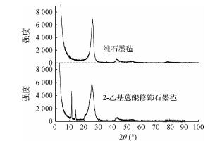 通過X-射線衍射可以定性地判斷石墨氈上修飾的催化劑的結構類型,圖2為純石墨氈和2-乙基蒽醌修飾石墨氈的X-射線衍射圖譜。由圖2可以看出,在26°左右2種石墨氈均有衍射峰,經對比鑒定,該處峰為石墨C晶體;而2-乙基蒽醌修飾石墨氈上在10°~15°之間出現了2個較窄衍射峰,純石墨氈上沒出現,經鑒定該處峰為2-乙基蒽醌,其晶體結構為單斜晶體。這表明石墨氈上較好的修飾了2-乙基蒽醌晶體。具體參見http://www.bnynw.com更多相關技術文檔。