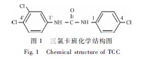 三氯卡班(三氯碳酰苯胺或三氯對二苯脲,TCC)是個人護理用品(如抗菌香皂、抗菌牙刷和牙膏)中一種常見的抗菌殺菌劑。TCC通常在使用后被直接沖洗到自然水體中,因此是水體中檢出率較高的有機污染物之一[4-7]。有文獻報道,在污水處理廠下游水體中藻類[8]和蝸牛[9]體內均檢測到了高濃度的TCC,說明TCC在生物體內有蓄積作用。另有研究證實,TCC的暴露增加了人類卵巢細胞中雌二醇的基因表達[10]。同時,發現TCC能影響樹蛙與老鼠體內對甲狀腺荷爾蒙做出響應的基因的轉錄[11]并能抑制水溶性環氧化物-水解酶[12]。