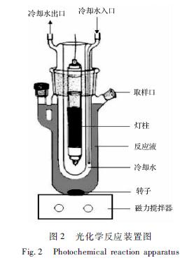 TCC光降解反應在圓柱形石英玻璃反應器中進行(圖2)。燈柱放置于柱形管中,柱形管外有循環水加熱套以減少紅外輻射及冷卻燈柱。使用了2種燈柱,紫外燈(125W 高壓汞燈)與氙燈(125W)。在反應器中加入已知濃度的TCC溶液(除2.3外,其他TCC溶液初始濃度均為5mg/L、pH =6.7)250mL,整個反應過程中反應液保持攪拌(250r/min)以確保混合充分。循環水使反應溫度穩定為(25±1)℃。每隔10min取樣2mL進行分析。