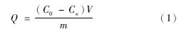 式中:Q為KCMV的吸附量(mg/g);C0 為初始溶液中Cr(Ⅵ)的濃度(mg/L);Ce 為吸附后上清液中Cr(Ⅵ)的濃度(mg/L);m為KCMD的質量(g)