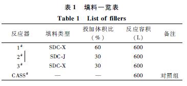 填料:實驗采用2種填料,新型填料是用羥基樹脂制成,SDC-J比表面積約為585m2/m3,密度0.97g/cm3,比容0.1cm3/g,SDC-X填料比表面積約為480m2/m3,密度0.95g/cm3,比容0.1cm3/g。