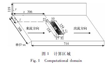料堆是以一個典型三維棱臺為模型進行數值模擬。棱臺參數[14]設置為:下表面長154m,寬51m;棱臺高17m,上表面長113m,寬10m。抑塵網距料堆距離為1倍堆高,網長等于堆長。相關研究[15,16]表明,最佳網高在1~1.5倍的堆高范圍內,故網高取22m(1.3倍堆高)。計算區域的選擇對數值模擬的結果及精度至關重要,直接影響結果可靠性。計算區域過大會網格數多,增加不必要的計算時間;計算區域過小,邊界影響計算結果的準確性。針對計算域問題,課題組前期做了相關研究[17]得出,當計算區域長取14倍堆寬,寬度取2倍堆長,高度取7倍的堆高,堆前6倍堆寬時料堆表面剪切力這一宏觀量不再變化。所以計算區域取為714m×119m×308m的長方體。x方向沿堆寬方向,y方向沿堆高方向,z方向沿堆長方向,來流方向沿x正方向,如圖1所示。