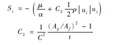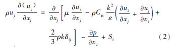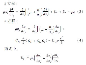 采用標準k-ε方程[18]來模擬三維流場,其中包括湍動能k方程和耗散率ε方程。