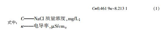 由圖 1可知,NaCl溶液電導(dǎo)率與溶液中離子的濃度呈較好的線性關(guān)系,即溶液電導(dǎo)率的變化可間接反映溶液中NaCl濃度的變化。因此,可通過溶液電導(dǎo)率的變化來評價(jià)除鹽的效果。由圖 1擬合得出25 ℃下溶液電導(dǎo)率與溶液濃度的關(guān)系式: