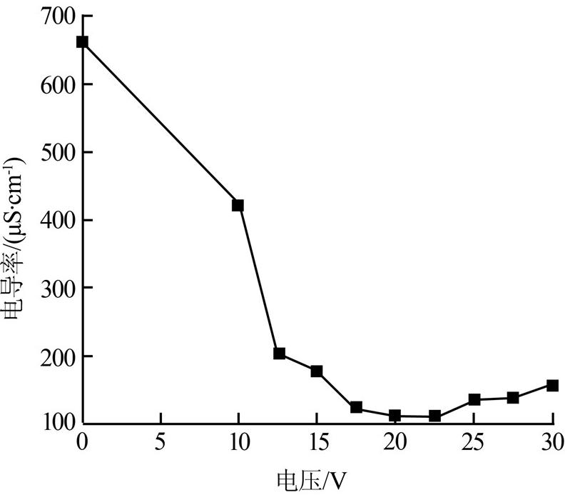 由圖 2可知,隨著外加電壓的增大,電導(dǎo)率呈現(xiàn)先下降后緩慢上升的變化趨勢。當(dāng)電壓從10 V提高到17.5 V時(shí),電導(dǎo)率快速下降;當(dāng)電壓從17.5 V提高到22.5 V時(shí),電導(dǎo)率變化不大,在電壓為22.5 V時(shí),電導(dǎo)率去除率最大,為83.5%,此時(shí)吸附除鹽量為0.273 mg/cm2;當(dāng)電壓從22.5 V增加到30 V時(shí),電導(dǎo)率略有上升。實(shí)驗(yàn)結(jié)果表明,在電壓為10~ 17.5 V的范圍內(nèi),電壓的作用明顯,提高電壓加快了溶液中離子向電極表面的遷移和富集,使得溶液主體中的離子濃度迅速下降,溶液電導(dǎo)率下降明顯;在電壓為17.5~22.5 V的范圍內(nèi),電極表面離子吸附基本達(dá)到飽和,吸附和脫附過程處于動(dòng)態(tài)平衡,因此電導(dǎo)率變化不明顯;繼續(xù)提高電壓,溶液中出現(xiàn)少許微小氣泡,說明此時(shí)溶液出現(xiàn)了一定程度的電解,導(dǎo)致溶液電導(dǎo)率略有上升?梢,在不發(fā)生水解和吸附未達(dá)飽和的前提下,提高電壓有助于大幅提高溶液中NaCl的去除效率,因此確定最佳的電壓為20 V。