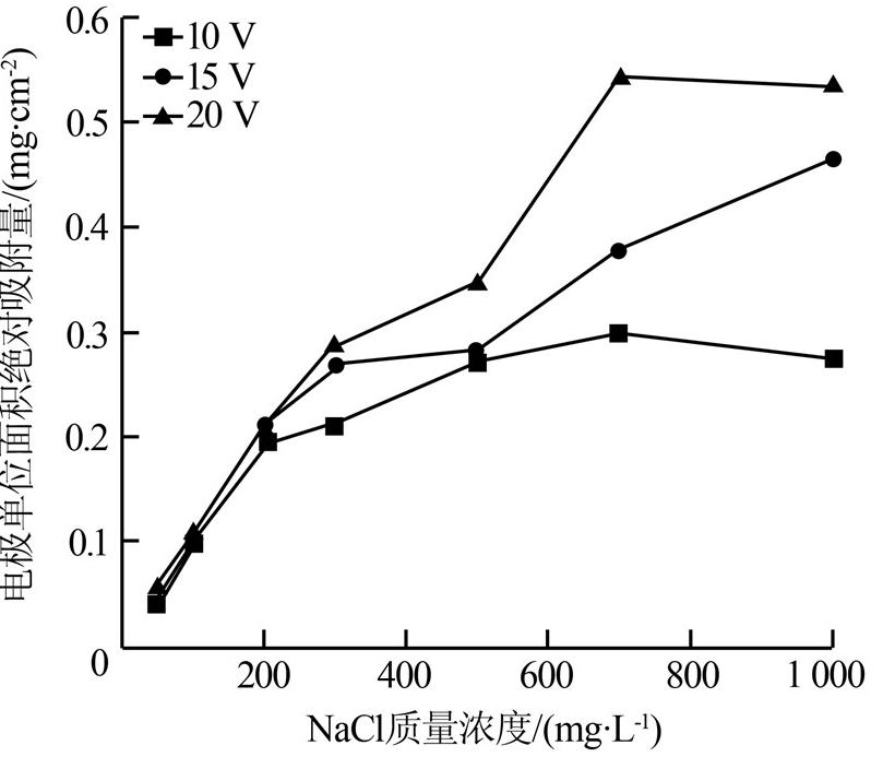 (3)對于低濃度NaCl溶液(<300 mg/L),當(dāng)外加電壓為15、20 V時(shí),溶液電導(dǎo)率去除率可達(dá)80%以上,最大可達(dá)91%。隨著溶液濃度的增加,電導(dǎo)率去除率下降明顯,但電極的絕對吸附量卻顯著增大。