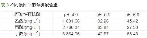 表 3表明,pH=4.0時細胞內酸性末端產物的積累是影響復合菌群代謝的限制因素,此時無論乙酸含量還是有機酸總量都是最多的〔14, 15, 16〕。當pH=5.5時,NADH+/NAD+平衡成為主要的影響因素,由于丙酸代謝途徑能夠氧化過多的NADH+,為使NADH+再生,產乙酸氧化過程與丙酸代謝途徑相偶聯,因此在pH=5.5時末端產物丙酸所占比例顯著增加〔17〕。當pH=6.8時,細菌的大量繁殖對NADH+(NADPH+)的需求量增加,此時合成代謝控制發酵途徑,所以在此pH條件下,乙酸和丁酸的比例有所增加。復合菌群代謝產物分析結果表明,在pH為4.0、5.5、6.8時,復合菌群都能通過代謝途徑來調節最終代謝產物以適應外界條件的變化。
