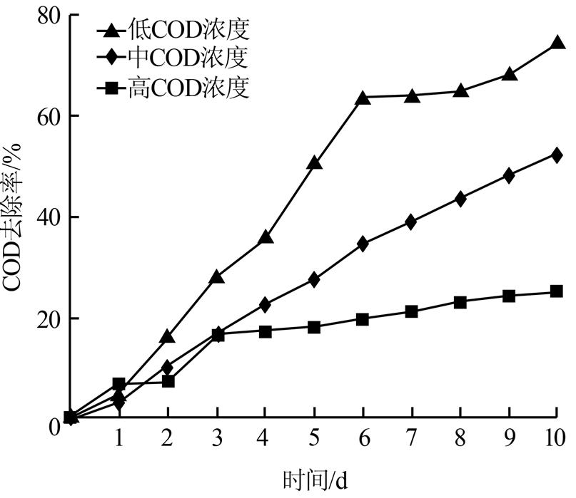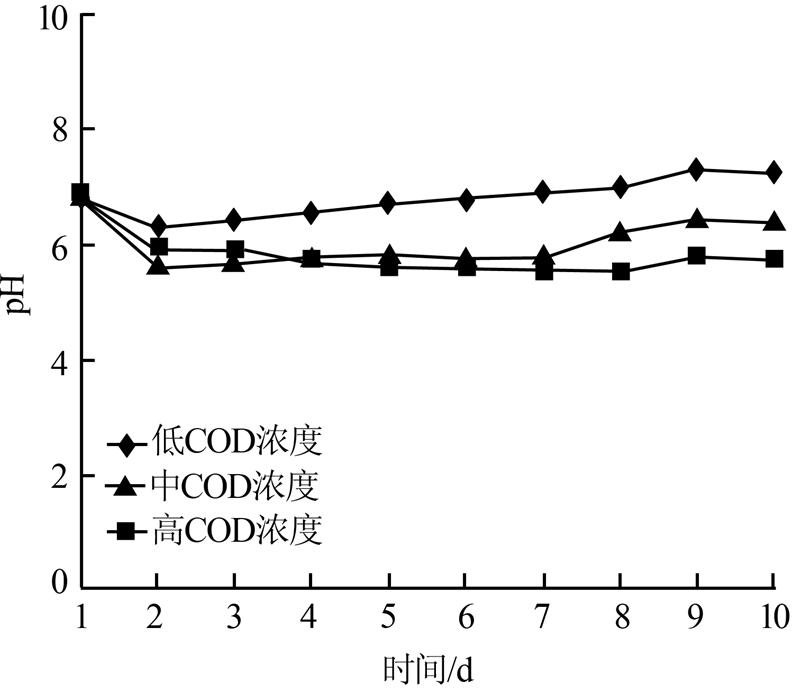 圖 3表明,當降解反應時間達到10 d時,低、中、高COD濃度下的COD去除率分別為74.7%、52.3%和25.1%,呈下降趨勢。降解過程中相應的pH(見圖 4)則呈現出迅速下降然后緩慢上升的過程,這是由于降解過程中糖蜜酒精廢液中還原糖等有機物大量水解導致pH迅速下降,但在低pH條件下復合菌群代謝產物發生改變以及水解產物不斷被降解,又引起pH緩慢上升。COD濃度對復合菌群降解性能影響實驗結果表明,為了縮短處理系統啟動時間,保證系統能夠穩定運行,初始COD濃度不宜超過12 000 mg/L。