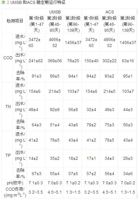 3種COD負荷條件下UMSB和ACS系統穩定期的運行特征如表 2所示。
