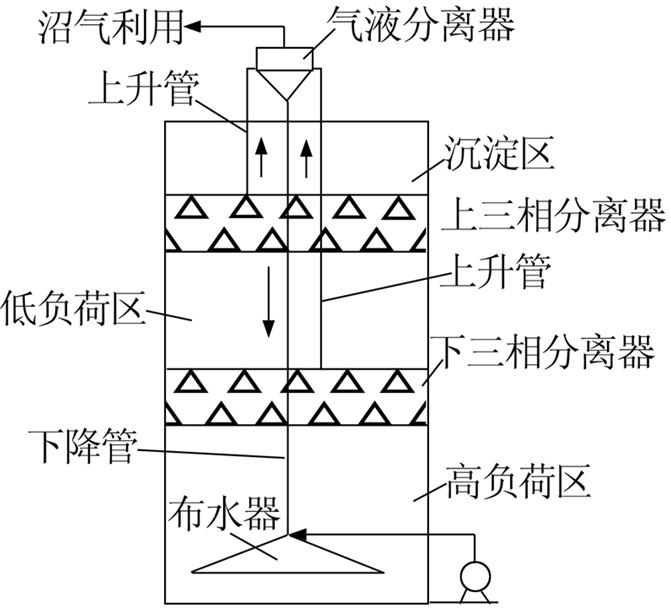 上旋流厭氧反應(yīng)器主要由布水器、提升裝置、三相分離器、氣液分離器及出水裝置等組成。相對(duì)于傳統(tǒng)的IC反應(yīng)器,上旋流厭氧反應(yīng)系統(tǒng)中使用了研制的新型布水器、優(yōu)化后的內(nèi)循環(huán)沼氣提升系統(tǒng)和改進(jìn)型三相分離器。