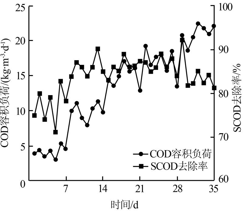(3)通過(guò)分析不同容積負(fù)荷下的SCOD去除率發(fā)現(xiàn),穩(wěn)定運(yùn)行階段,COD容積負(fù)荷提高到20kg/(m3·d)以上時(shí),SCOD去除率為84%,雖然較負(fù)荷提高階段的SCOD去除率有所降低,但是達(dá)到了設(shè)計(jì)指標(biāo),且運(yùn)行穩(wěn)定。