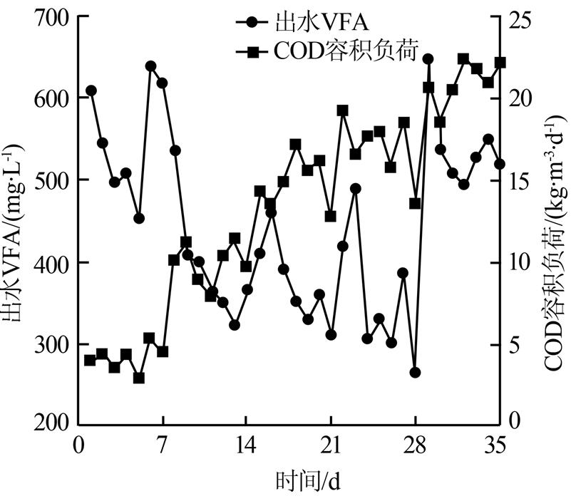 VFA是厭氧消化過(guò)程中有機(jī)物降解的中間產(chǎn)物,有機(jī)物經(jīng)水解反應(yīng)后產(chǎn)生VFA,產(chǎn)甲烷菌利用VFA產(chǎn)生甲烷。所以,VFA在厭氧反應(yīng)器中的變化能反映出產(chǎn)甲烷菌的活性狀態(tài)。試驗(yàn)過(guò)程中對(duì)上旋流厭氧反應(yīng)器中VFA的變化進(jìn)行了連續(xù)監(jiān)測(cè),發(fā)現(xiàn)VFA的波動(dòng)與運(yùn)行容積負(fù)荷有密切關(guān)系,如圖 7所示。