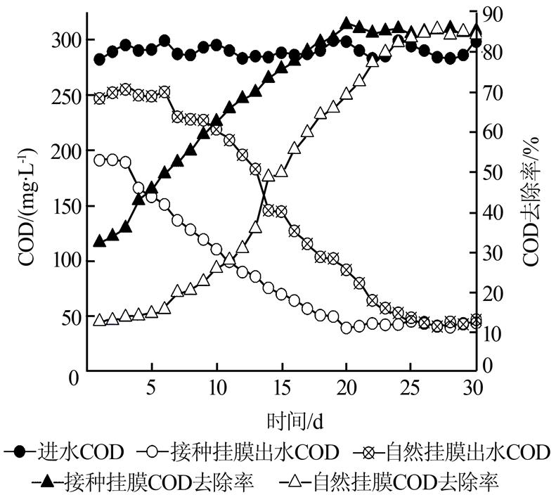 在整個30 d的掛膜試驗期間,進行了接種掛膜法和自然掛膜法的比較,結(jié)果分別見圖 2和圖 3。