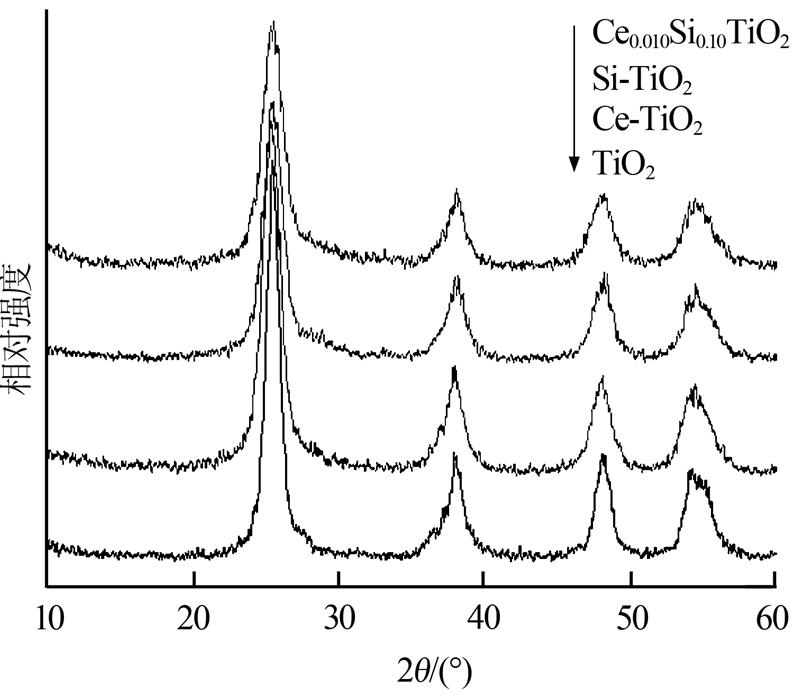 由圖 1可知,所有樣品在20°~60°之間均出現了5個衍射峰,這5個衍射峰經檢索分別對應銳鈦礦TiO2的(101)、(004)、(200)、(105)和(211)晶面,說明Si、Ce和Si-Ce的引入沒有改變TiO2的晶型結構。另外,從圖 1還可以看出,添加了Si和Si-Ce后,(101)半峰寬變大,峰強度降低,說明催化劑的晶粒變小,結晶度略有降低,而晶體顆粒變小,則樣品的比表面積會增大。