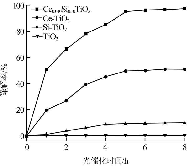 考察了TiO2、Si-TiO2、Ce-TiO2和Ce0.010Si0.10TiO2在可見光照射下催化降解甲基橙的性能,結果如圖 3所示。