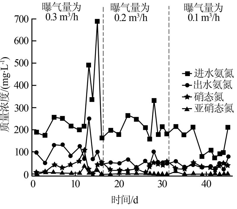 由圖 2可以看出,當曝氣量為0.3m3/h時,由于進水氨氮波動大,對氨氮的去除造成一定的影響,氨氮去除率不穩(wěn)定;亞硝態(tài)氮質量濃度基本在10mg/L以下,在這個過程中沒有發(fā)現(xiàn)亞硝酸鹽的積累;隨著氨氮的去除,硝態(tài)氮濃度緩慢上升,但上升幅度不大,且在第12天后有所下降。初步判斷,在0.3m3/h的曝氣量下,有同步硝化反硝化的脫氮趨勢。當曝氣量為0.2m3/h時,對氨氮的去除已經(jīng)不受進水氨氮變化的影響,基本沒有較大波動;亞硝態(tài)氮質量濃度維持在1mg/L以下,相比于曝氣量為0.3m3/h時有大幅度下降,并且沒有發(fā)現(xiàn)亞硝酸鹽的積累;硝態(tài)氮的濃度也基本趨于穩(wěn)定。因此,可以確定在曝氣量為0.2m3/h時,主要進行的是同步硝化反硝化脫氮,由于亞硝態(tài)氮的濃度很低,反硝化很可能比硝化反應進行得快。當曝氣量為0.1m3/h時,硝態(tài)氮和出水氨氮濃度變化幅度開始變大,氨氮去除率不穩(wěn)定;但亞硝態(tài)氮質量濃度低于曝氣量為0.2m3/h時的情況,基本保持在0.5mg/L以下。由此可以推斷,當曝氣量為0.1m3/h時,脫氮過程中反硝化進程比較順利。
