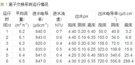 離子交換系統由陽床、陰床、混床、加壓水箱和管閥件組成。廢水經預過濾系統后利用余壓進入陽床,陽床產水由泵加壓后再依次進入陰床和混床。各級樹脂床均裝有取樣閥,在混床出水處設有pH計、流量計和電導率儀,對出水水質進行實時在線監測。其現場安裝情況如圖 2所示。