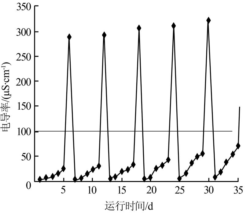 出水pH的變化可在一定程度上反映樹脂的飽和程度和再生周期。由圖 4可知,運行期間離子交換系統出水pH基本維持在5.5~6.5。當pH <6.0時樹脂存在需要再生的可能。由圖 5可知,正常情況下離子交換系統出水電導率維持在100 μS/cm以下,相應的鎳離子質量濃度<0.5 mg/L,鎳去除率可達95%以上。當出水電導率超過100 μS/cm時,需考慮對樹脂進行再生。