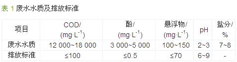 江蘇某化工企業(yè)癸二酸生產(chǎn)廢水主要是由蓖麻油在苯(甲)酚作用下經(jīng)水解、裂解得到癸二酸鹽溶液,再進行中和、酸化、沉降、過濾分離出癸二酸結(jié)晶固體后得到的高含鹽含酚廢水;另外該企業(yè)還產(chǎn)生少部分生活污水。企業(yè)廢水總排放量為500 m3/d。廢水水質(zhì)及排放標(biāo)準(zhǔn)如表 1所示。