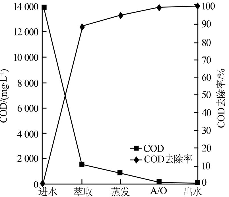 由圖 2可知,萃取出水COD<1 500 mg/L,蒸發(fā)后出水COD<800 mg/L,廢水中的酚類、脂肪酸類、癸二酸酯類、甘油等均能夠生化降解,經(jīng)A/O生化處理后出水COD<50 mg/L,整個系統(tǒng)COD總?cè)コ?gt;99%。