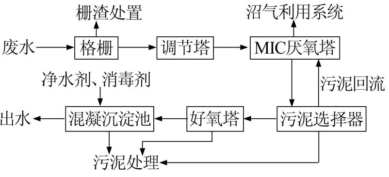 首先通過(guò)格柵去除廢水中較大的懸浮物,再通過(guò)調(diào)節(jié)塔對(duì)廢水進(jìn)行均質(zhì)、均量處理。調(diào)節(jié)塔出水通過(guò)提升泵進(jìn)入IC厭氧塔進(jìn)行厭氧處理。IC厭氧塔出水進(jìn)入污泥選擇器進(jìn)行泥水分離,分離出的部分污泥回流到IC塔內(nèi),部分排放至污泥池進(jìn)行處理,其出水進(jìn)入好氧塔進(jìn)行好氧降解,進(jìn)一步去除廢水中的COD、BOD5。最后,對(duì)經(jīng)過(guò)生物處理的廢水進(jìn)行混凝沉淀處理,以保證最終出水的達(dá)標(biāo)排放或回用。與其他工藝相比較,該工藝采用了IC厭氧塔+污泥選擇器設(shè)計(jì),其具有抗沖擊負(fù)荷能力強(qiáng)、啟動(dòng)周期短、初始穩(wěn)定性好等特點(diǎn),并且污泥選擇器就相當(dāng)于二沉池,不僅可保證IC厭氧塔中的污泥濃度,同時(shí)也可降低進(jìn)入好氧反應(yīng)段的廢水中的SS,保證整個(gè)系統(tǒng)的高效運(yùn)行。