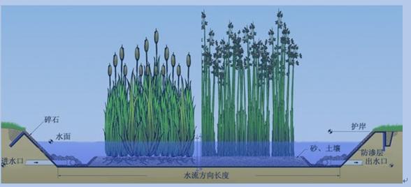 地埋A/O-人工濕地技術是在常規生化處理基礎上增設人工濕地系統進行深度處理。人工濕地系統是人為的在有一定長寬比和底面坡度的洼地上用土壤和填料(如礫石等) 混合組成填料床,使污水在床體的填料縫隙中流動或在床體表面流動,并在床體表面種植性能好、成活率高、抗水性強、生長周期長、美觀及具有經濟價值的水生植物(如蘆葦,蒲草和美人蕉等) ,形成一個“基質—微生物—植物”的復合生態系統,并利用這種復合生態系統獨特的凈化功能進行水質高效凈化。