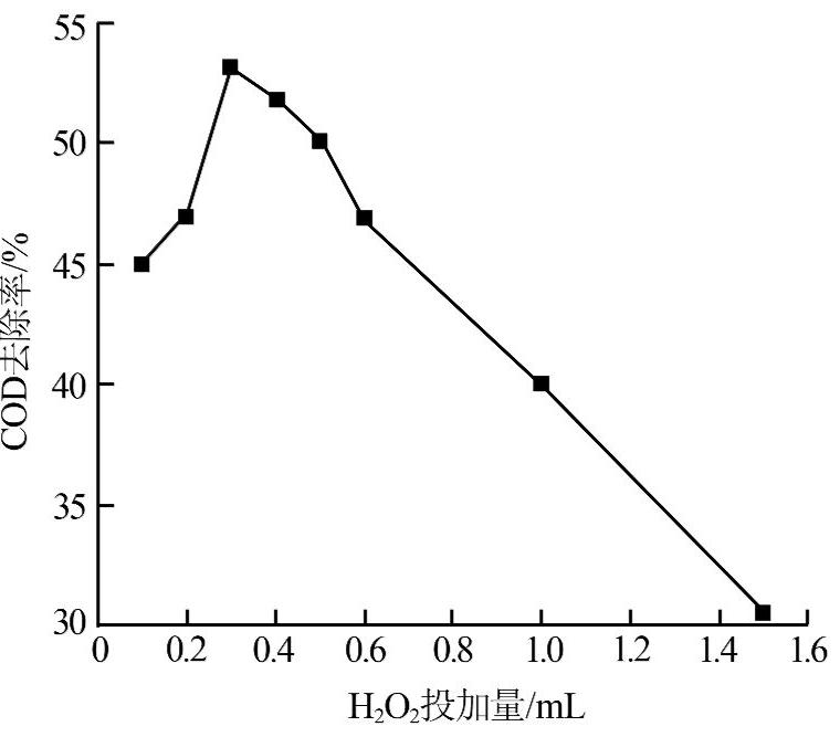 實驗選取6% H2O2 0.1、0.2、0.3、0.4、0.5、0.6、1.0、1.5 mL投加到反應體系中,進行濕式催化氧化實驗,其他條件不變,研究了 H2O2投加量對COD去除率的影響,結果見圖2。