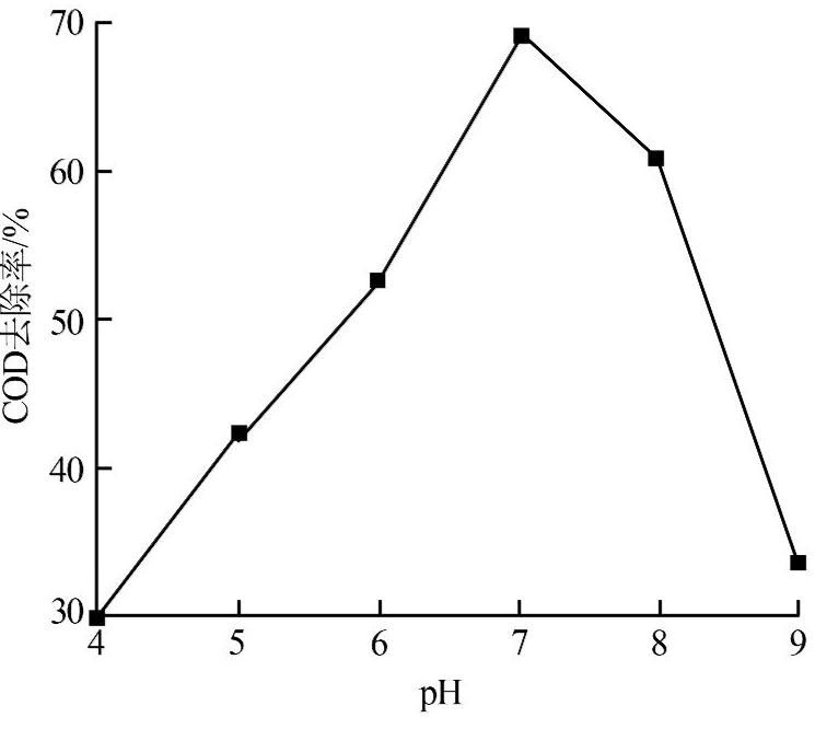 用HCl和NaOH調節混合溶液的pH分別為4、5、6、7、8、9,進行濕式催化氧化實驗,其他條件不變,研究了pH對COD去除率的影響,結果見圖3。