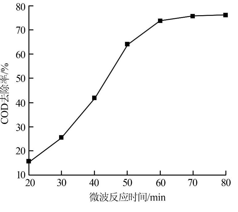試驗分別選取微波反應時間20、30、40、50、60、70、80 min,進行濕式催化氧化實驗,其他條件不變,研究了微波反應時間對COD去除率的影響,結果見圖5。