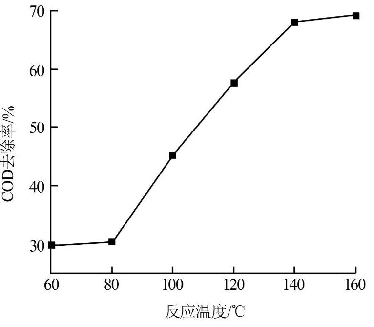 選擇不同的微波反應溫度60、80、100、120、140、160 ℃,進行濕式催化氧化實驗,其他條件不變,研究了微波反應溫度對COD去除率的影響,結果見圖6。