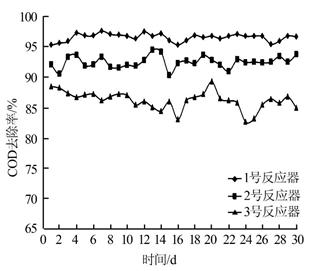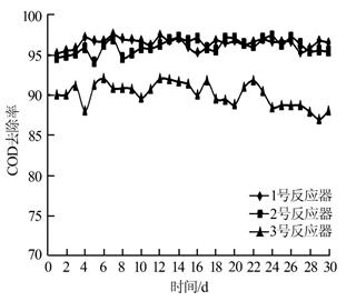 圖5和圖6是3個反應器出水COD和COD去除率的變化情況。