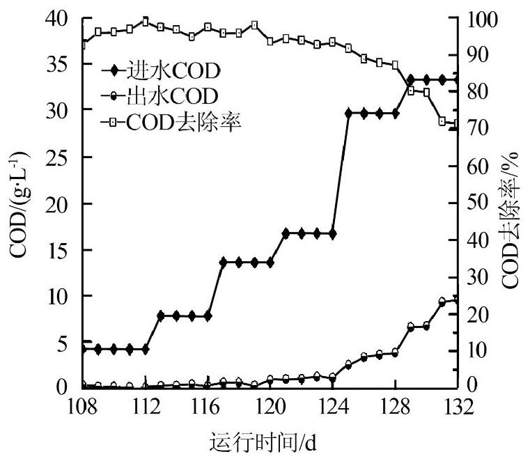 由圖3可知,當(dāng)進(jìn)水COD小于18 g/L時(shí),出水堿度穩(wěn)定在3 g/L左右。但當(dāng)進(jìn)水COD再提高時(shí),仍按照先用NaOH調(diào)節(jié)pH至6.0再用NaHCO3調(diào)節(jié)pH至7.0的方法調(diào)節(jié)pH需要加的NaHCO3的量增加很多,導(dǎo)致進(jìn)水中HCO3-含量大幅增加。同時(shí)厭氧是一個(gè)產(chǎn)生堿度的過(guò)程,進(jìn)水COD的提高,也會(huì)使反應(yīng)體系產(chǎn)生的堿度提高。兩方面因素導(dǎo)致體系中的酸堿平衡被破壞,pH大幅增加,產(chǎn)甲烷菌活性在pH大于10時(shí)受到嚴(yán)重的抑制,導(dǎo)致反應(yīng)器崩潰。所以,當(dāng)進(jìn)水COD大于18 g/L時(shí),無(wú)需添加NaHCO3調(diào)節(jié)堿度,只需添加NaOH調(diào)節(jié)進(jìn)水pH至7.0左右即可。