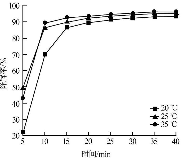 按照實驗方法,調整PAP溶液初始pH=6,通入流量為50 L/h的臭氧,分別在20、25、35 ℃下進行降解,實驗結果如圖1所示。