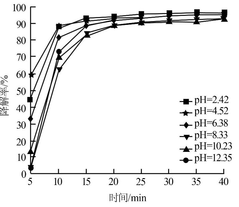 配制6個不同初始pH的PAP溶液分別進行臭氧降解實驗,調節pH分別為2.42、4.52、6.38、8.33、10.23、12.35,固定溫度在25 ℃,通入流量為50 L/h的臭氧進行氧化處理,實驗結果如圖2所示。