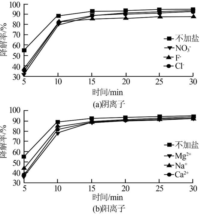 Cl-、F-、NO3-是PAP廢水中常見的陰離子,Na+、Mg2+、Ca2+是PAP廢水中常見的陽離子,本研究分別選取2 mmol/L的陰或陽離子加入到原溶液中進行研究。由圖5(a)可知,這3種陰離子對PAP廢水降解產生的影響都很大,使降解率降低,但相對來說F-的影響較小。這可能是因為F-分子結構較小,影響較小[8]。由圖5(b)可知,對于PAP,Ca2+、Mg2+的影響幾乎相同,Na+的影響較小,但都會抑制降解的進行。由此可見,鹽的存在不同程度地使PAP降解率降低。