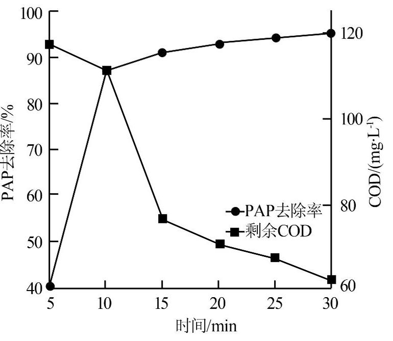 (3)30 min內的COD變化曲線表明,PAP經臭氧氧化后,COD大幅降低,提高了廢水的可生化性。