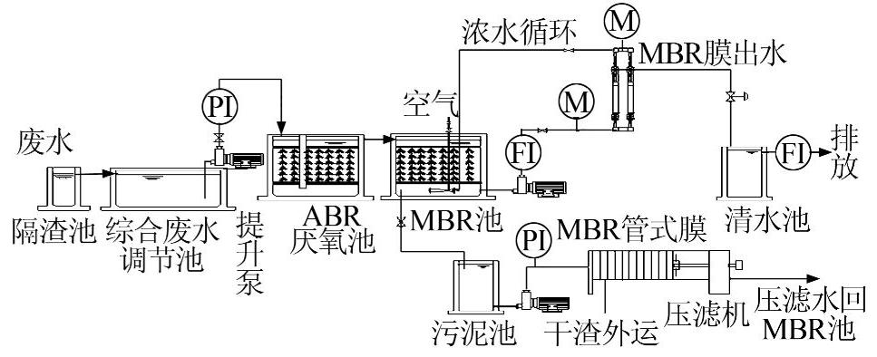 該廠廢水排放量為20 m3/d,設計最大處理能力為25 m3/d,廢水先經格柵去除大塊雜物后進入調節池,使水質水量充分混合均勻,再用泵提升進入折流板厭氧池,經3 d的厭氧處理去除大部分COD,然后自流入MBR池,經24 h的生化降解COD后經MBR膜過濾進入清水池,最后排放。