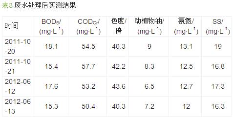 該工程2011年3月竣工后,經試運行3個月,于6月正式投入正常運行,從運行1 a的情況來看,系統運行穩定、處理效果顯著,出水水質良好,經環境監測站在不同的時期測得出水水質各項指標均己達到了《污水綜合排放標準》(GB 8978—2002)一級排放標準。測得的部分結果如表3所示。具體參見http://www.bnynw.com更多相關技術文檔。