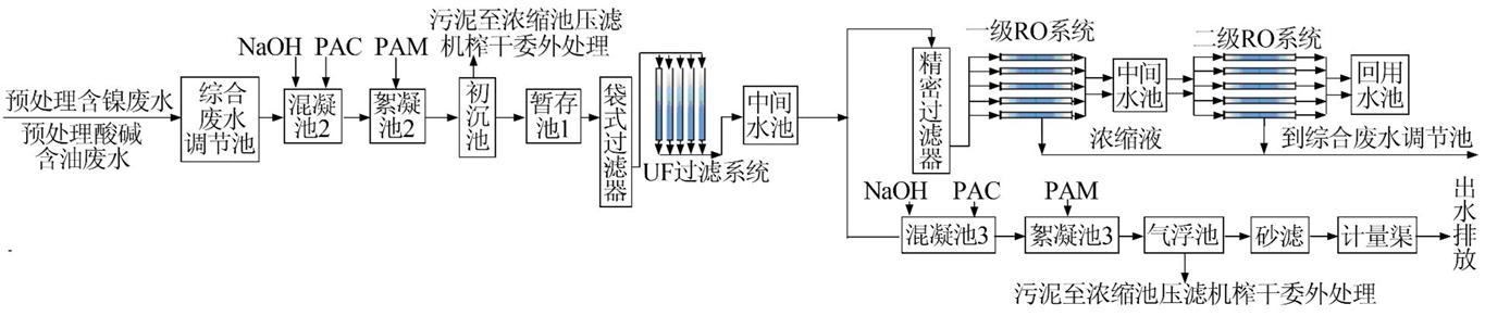 (2)在去除陽極氧化廢水中重金屬鎳的過程中,要加強(qiáng)對廢水預(yù)處理時pH的準(zhǔn)確控制,使鎳在進(jìn)入后續(xù)的RO等系統(tǒng)之前能實現(xiàn)較高的去除率,如此才能穩(wěn)定確保回用水及排放出水中鎳的質(zhì)量濃度在0.5 mg/L以下。