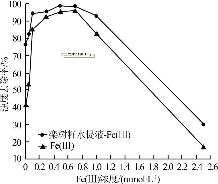 不改變溫度及pH,向100 mL、0.5 g/L的高嶺土懸濁液中加入0.5 mL質量濃度為5 g/L的欒樹籽水提液,改變Fe(Ⅲ)的濃度(分別為0.01、0.05、0.1、0.5、0.7、1.0、2.5 mmol/L),并與只加入硫酸鐵的絮凝試驗進行對照,結果如圖1所示。
