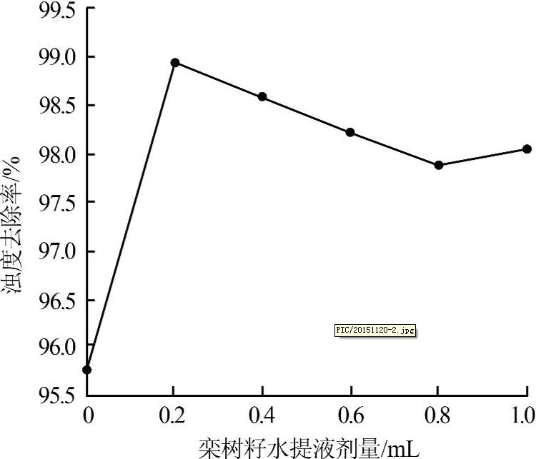由圖2可知,隨著欒樹籽水提液劑量的變化,濁度去除率先上升,后下降。但總體水平均很高。當5 g/L欒樹籽水提液的投加量為0.2 mL時,濁度去除率達到99%。因此,欒樹籽水提液的最佳劑量為 0.2 mL。
