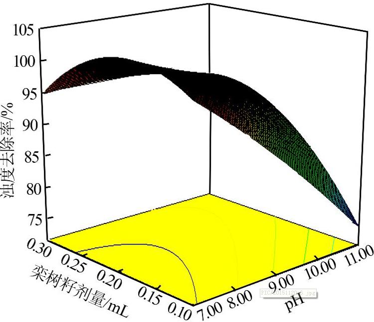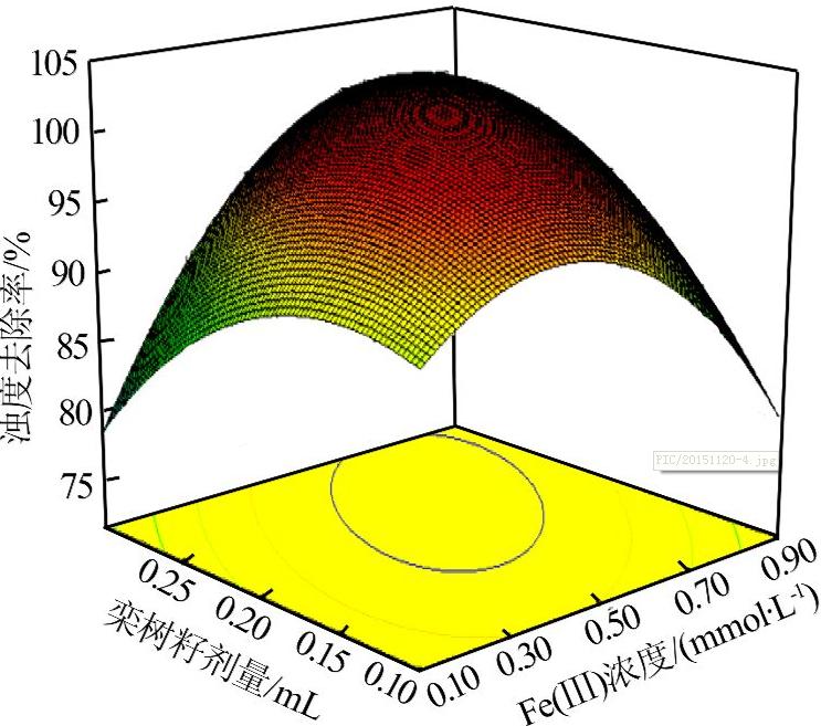 圖4~圖6表示的是三個因素相互之間交互作用的三維響應面圖。很明顯,濁度去除量出現了一個明顯的峰值,說明最大濁度去除量的最佳條件是在定義好的設計范圍內的。在圖4中,隨著欒樹籽水提液劑量增大,濁度去除率先增大后降低,隨Fe(Ⅲ)濃度的增大,濁度去除率也呈現出先增大后降低的趨勢,在定義區間的中間部分出現了峰值。圖5、圖6的情況與圖4類似。印證了單因子試驗得出的結論,且結果更加直觀。