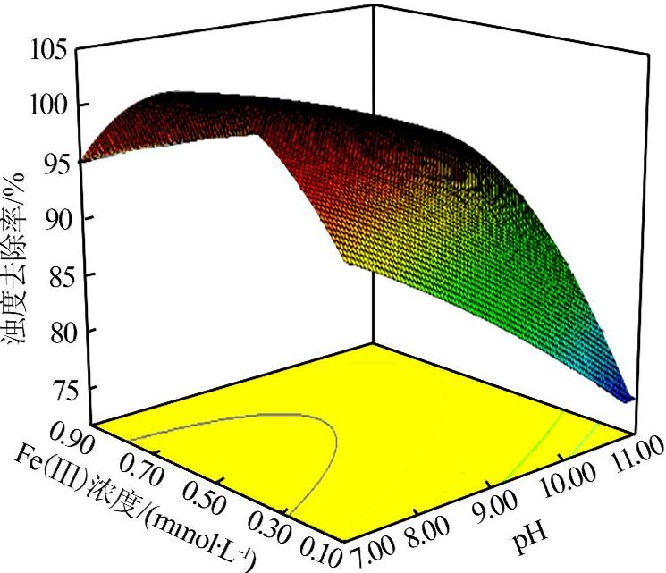 pH與Fe(Ⅲ)濃度對絮凝交互影響的三維曲面圖見圖5。