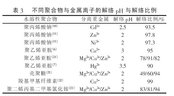 酸化法是將濃縮液的pH 調低, 破壞聚合物與金屬離子絡合體,從而釋放出金屬離子。在酸化后,選用恰當孔徑的超濾膜將聚合物與金屬離子分離。表3 總結了不同聚合物與金屬離子的解絡pH 與解絡比例。