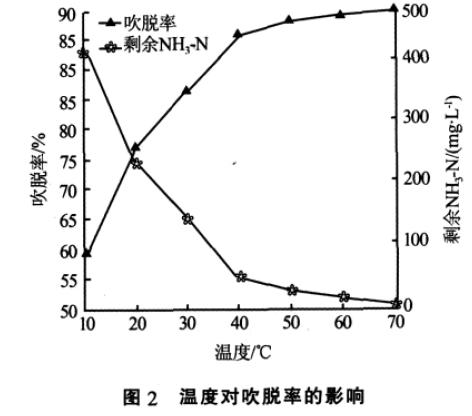 在廢水氨氮初始質量濃度為1 000 mg/L,pH≈11,氣液比為1 000∶1 條件下,考察了溫度對吹脫率的影響,結果見圖2。