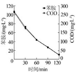 圖2 臭氧氧化對苯胺及COD的去除效果